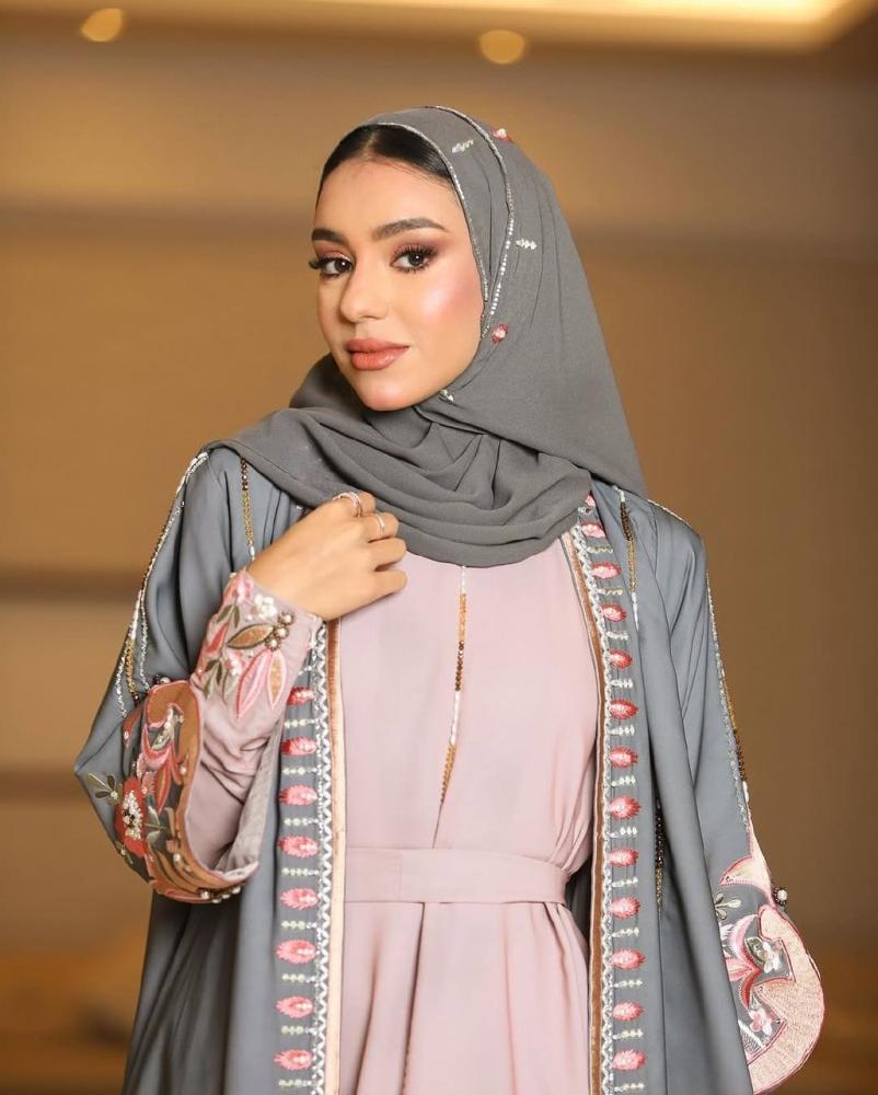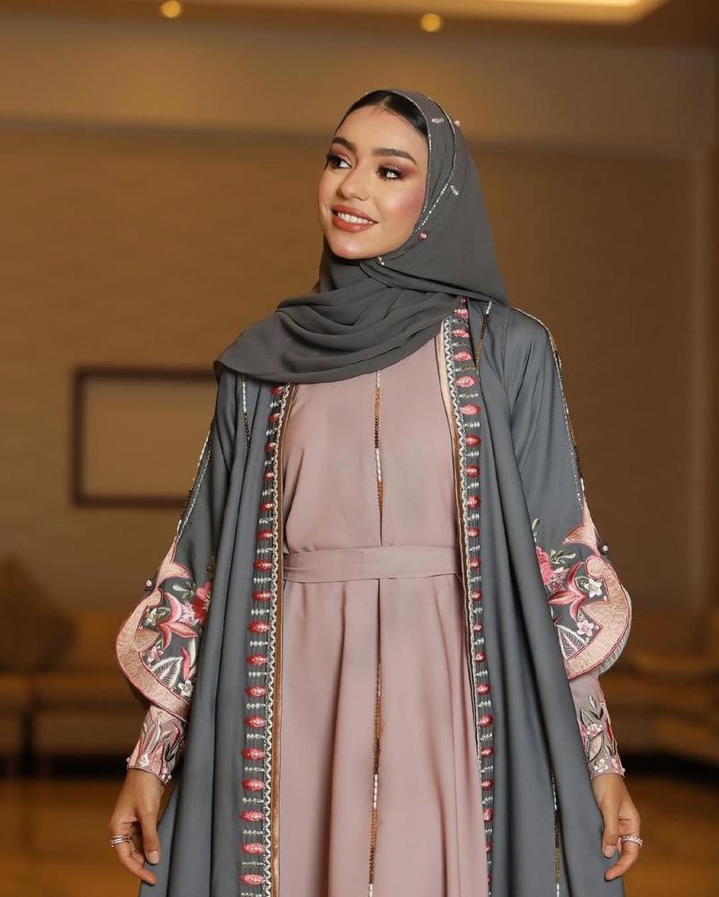 التفاصيل: عباية قماش كريب ملكي كـوري ،قصة كلوش، تطريز ملون، طرحة مثل لون العباية.,تطريز ملون.
