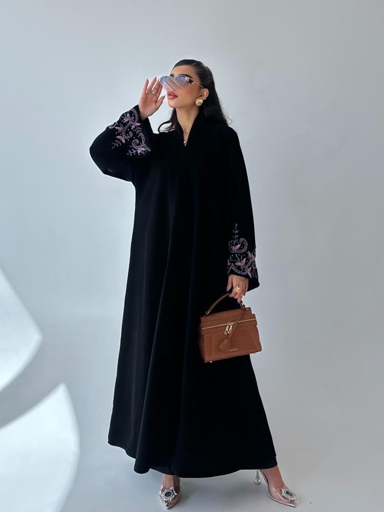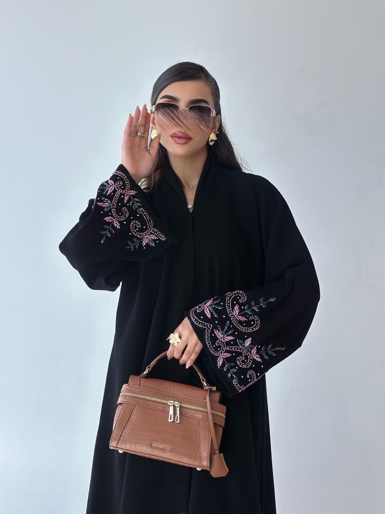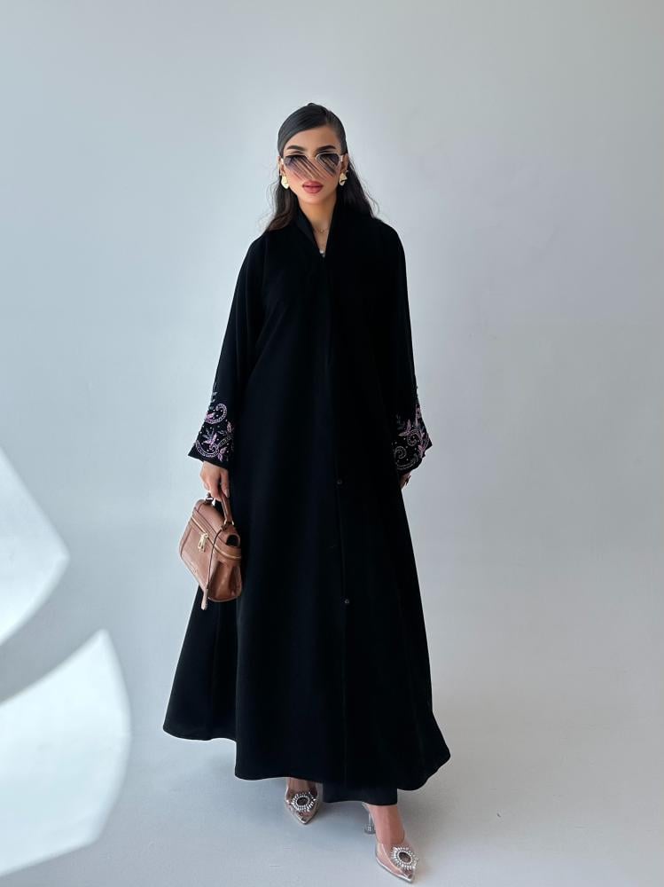 عباية سوداء ناعمة بلمسات تطريز أنثوية على الأكمام بألوان هادئة، مع تطريزات متداخلة من الزخارف الانسيابية والأوراق الناعمة تعطي روحًا ناعمة وراقية، بقصة عملية مع أكمام واسعة مريحة، مناسبة للخروج اليومي والمناسبات الأنيقة، وتُظهر شخصية مرتبة وناعمة مع الحجاب الأسود البسيط